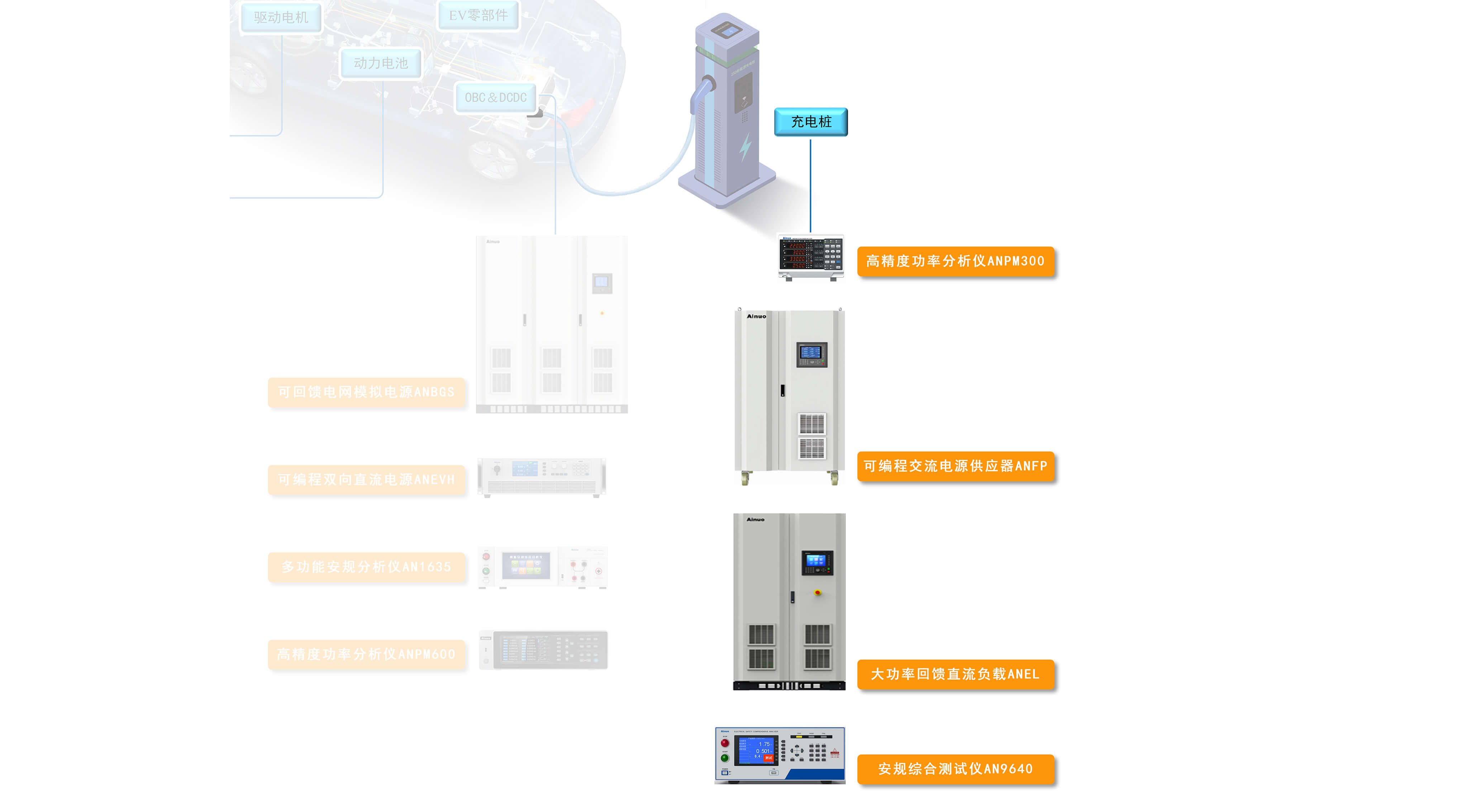新能源汽车的快速发展,也带动了充电桩等配套产业。充电桩分交流充电桩和直流充电桩。交流充电桩电压为220v和380V,直流超充800-1500V。充电桩的能量转换效率、安全性测试也至关重要。