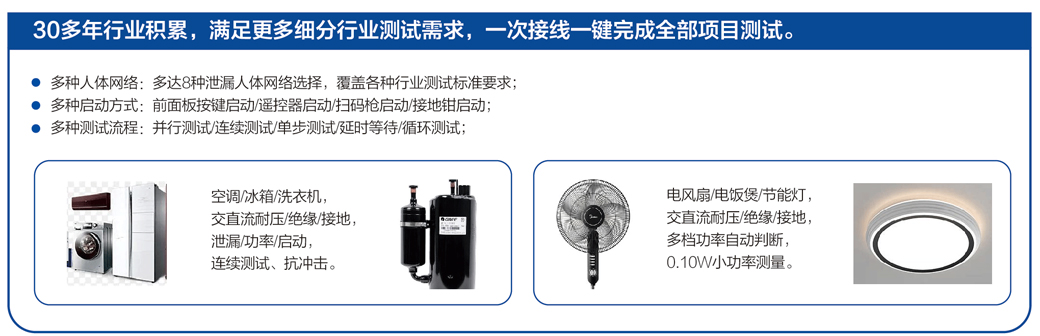电气安规综合测试仪凭借其卓越的性能和精准的检测能力,已成为众多行业不可或缺的核心设备。它在保障电气设备安全性和可靠性方面发挥着关键作用,广泛应用于以下重要领域。
