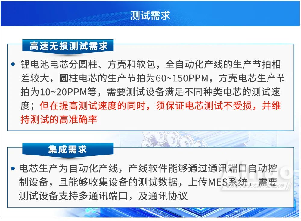 作为锂电池生产工艺流程中的核心工段,电芯组装的多个生产工序均需进行短路测试。但因锂电池种类多,相应的测试项目、参数等需求均不相同,增加了测试难度,具体需求如下:
