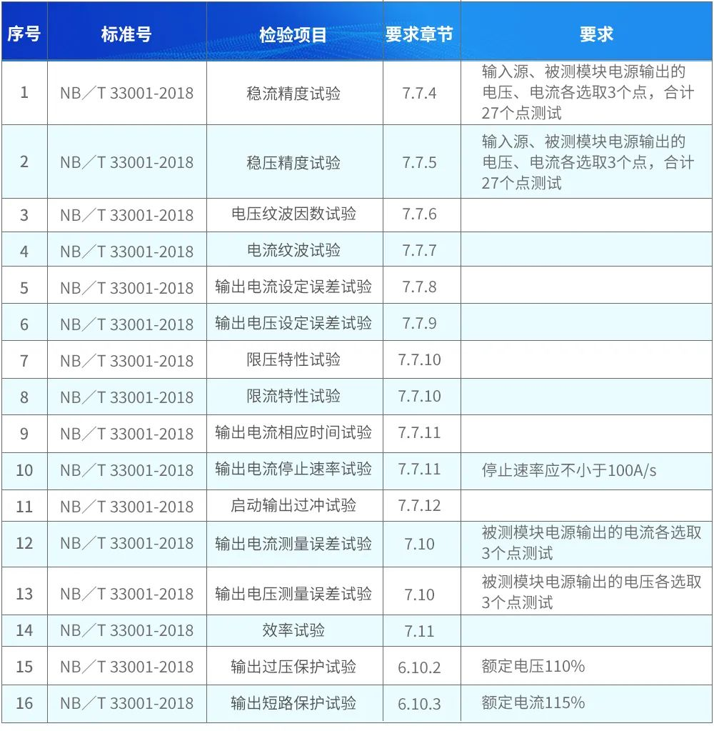 此标准中明确提出稳流精度测试、稳压精度测试、过压保护测试、短路保护测试,而其他标准中有对输出外特性和输出功率降额曲线进行测试的要求。此外CV充电是充电模块的重要功能,在实际充电模块测试中,需要多点测试电压电流稳定度。