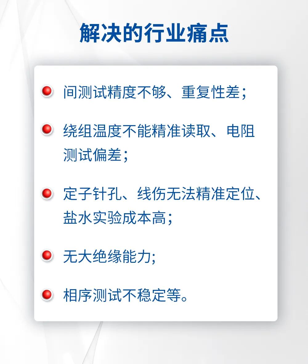 伺服电机在生产过程中,须经过严格检测,确保出厂各项测试指标均符合标准。根据GB/T 39553-2020《直流伺服电动机通用技术条件》及GB/T 7344-2015《交流伺服电动机通用技术条件》,伺服电机厂商在工艺闭环检验中,进行定转子综合性能测试、控制器测试、伺服整机综合性能等测试。而测试期间面临,匝间测试精度不足、重复性差、电阻测试偏差、无大绝缘能力和相序测试不稳定等行业痛点。