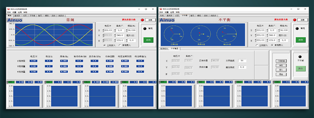 可回馈电网模拟电源ANBGS系列可通过RS485、RS232及LAN匹配电脑上位机用,用户可以很方便的通过电脑上位机对光伏逆变器进行测试。上位机界面见下图: