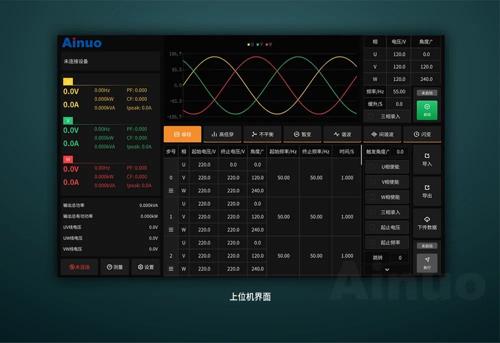 可回馈电网模拟电源ANRGS可通过RS485、RS232、GPIB或LAN进行通讯。电源内置SCPI与Ainuo3.0两种通讯协议,通讯指令可以对所有参数进行设置,电压频率等参数还可以进行在线修改,客户可以很方便的通过编写上位机脚本配合测试系统进行测试。