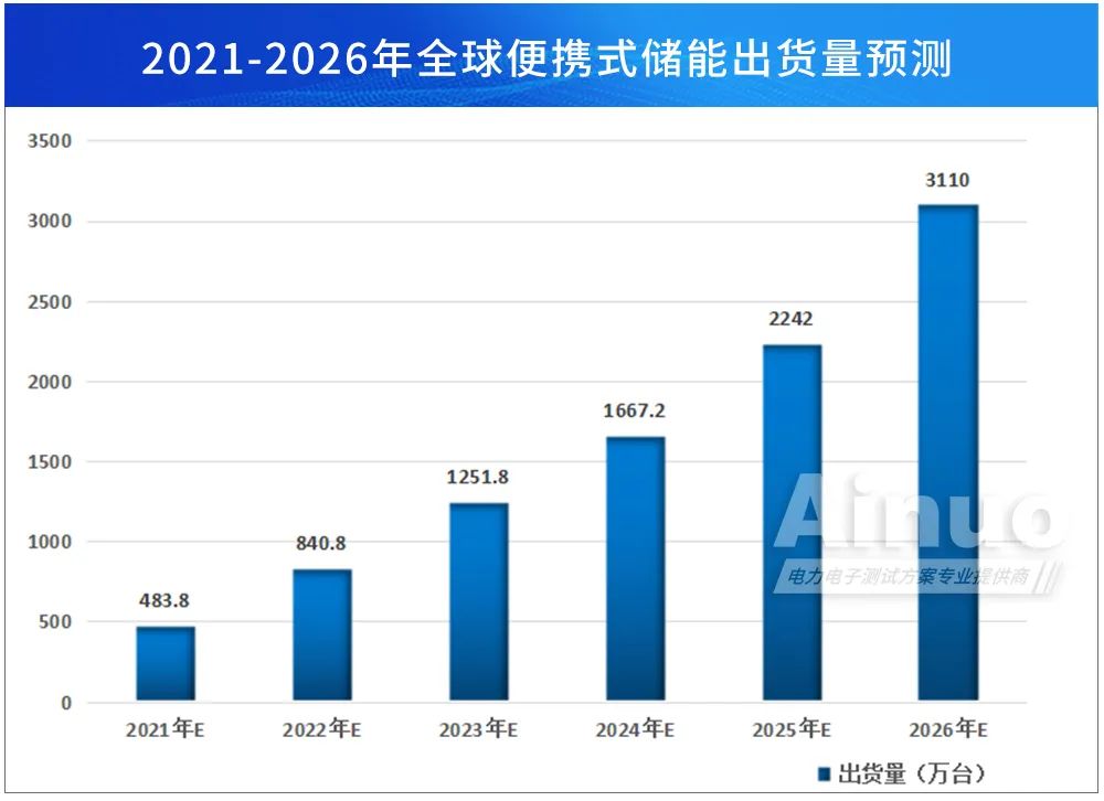 近年来,户外旅行和露营文化逐步盛行,便携式储能电源作为重要的“能源”站,市场需求规模呈高速增长态势。据CIAPS预测,2021年全球便携式储能出货量为483.8万台,到2026年全球便携式储能出货量将达到3110万台。